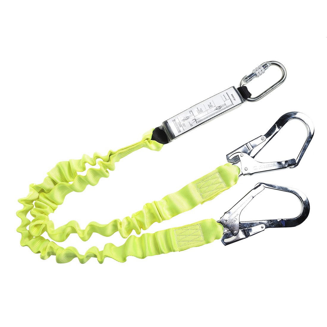 - Kettős végződésű, rugalmas hevederszalag energiaelnyelővel, két zárókapoccsal és karabinerrel.
