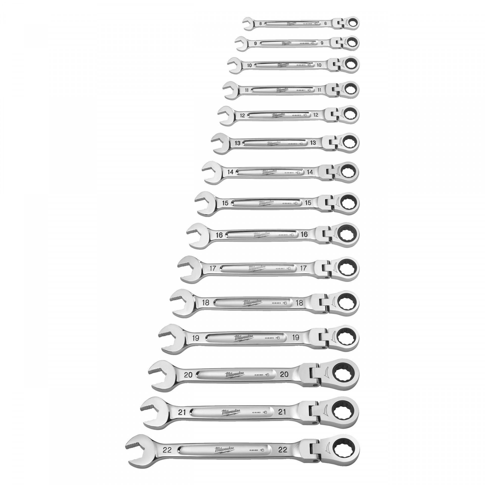 Milwaukee MAX BITE™ csuklós fejű racsnis csillag-villáskulcs készlet, metrikus, 15 darabos